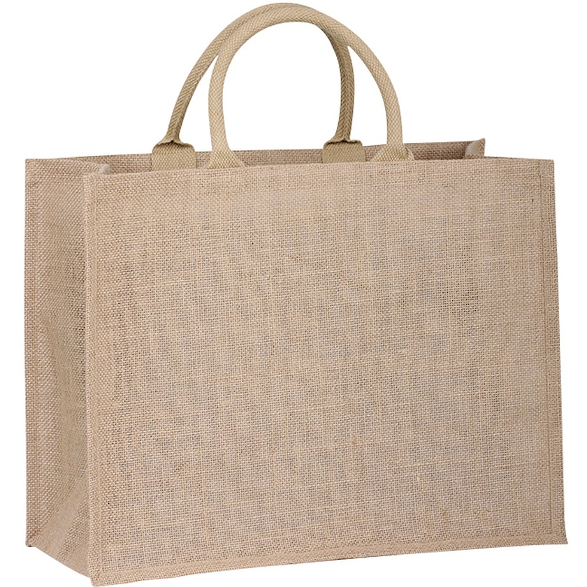 Jutepose med trykk og korte bærehåndtak. Takket være et realt format og en kraftig bunn passer den bra for å bære tyngre og mer klumpete ting. Jute er dessuten et miljøvennlig materiale som gjør posen til et bra miljøvalg. Ettersom jute er et ganske grovt materiale er det kun mulig å trykke enklere motiv.