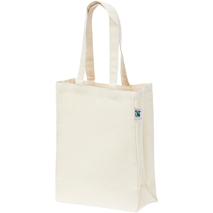 Fairtrade-sertifisert handlenett av kraftig 310 grams bomull. Posen har side og bunnbelg som gjør den ekstra romslig. Utvendig finnes en etikett som viser at posen er laget av 100% Fairtrade-sertifisert bomull. Håndtaket har en lengde på 60 cm, som gjør at du kan bære posen både i hånden og over skulderen.