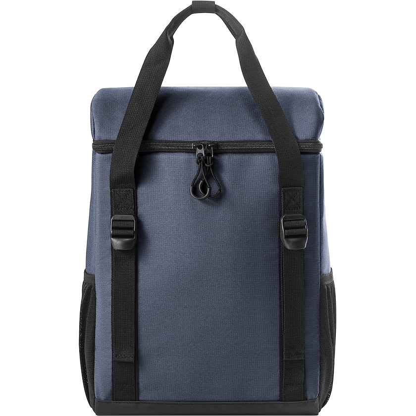 Miljøvennlig kjølebag av ryggsekkmodell. Det er nettinglommer på sidene. Rommer 16 liter. Stoffet er laget RPET, dvs. resirkulerte PET-flasker.