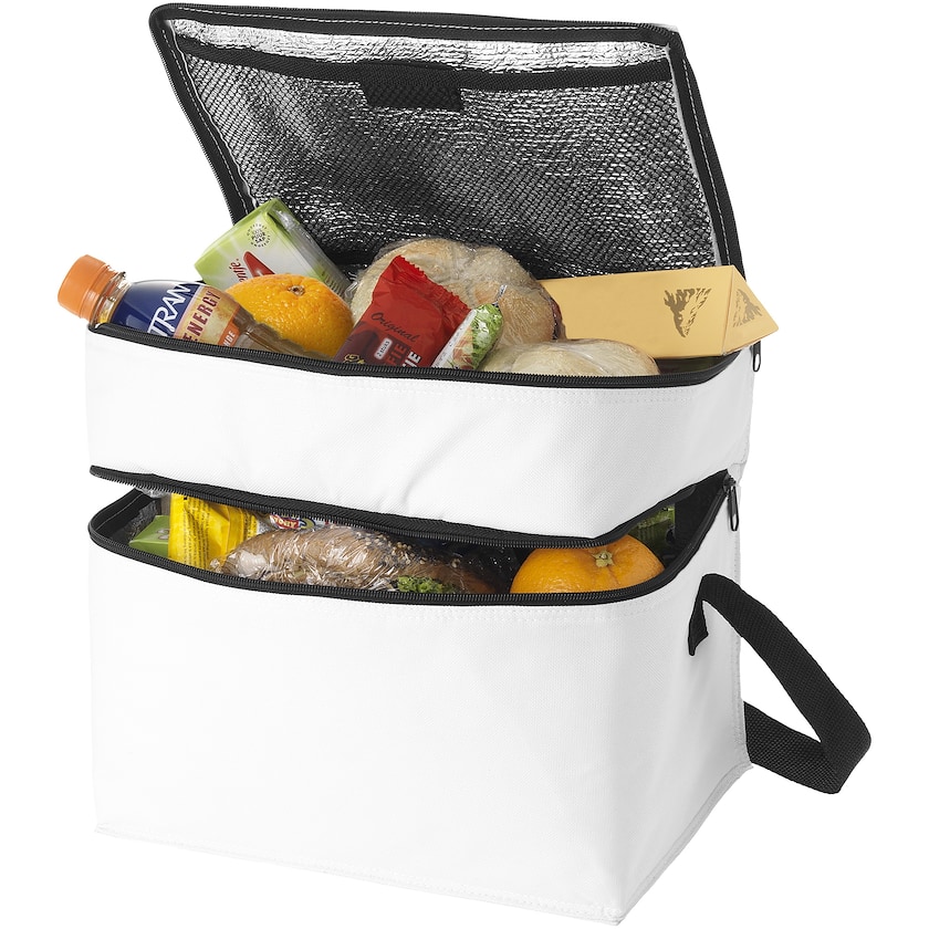 Praktisk kjølebag og to romslige lommer. Det øverste rommet er perfekt til mindre snacks og andre kjølevarer, mens det nedre er ideelt til større kjølevarer. Skulderremmen er justbar.