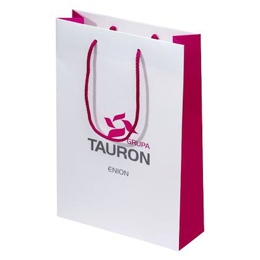 Moderne papirpose i størrelse medium med snørehåndtak og blanklaminering. Håndtak av snøre og blanklaminering gir posen den rette luksuriøse følelsen. Posen har kant og bunn forsterket av papp for ekstra holdbarhet. Du bestemmer selv designen på posens alle sider. Du kan også velge mellom en rekke farger til håndtaket. Trykk skjer i maks tre farger i henhold til Pantoneskalaen og derover i CMYK. Posen er laget i EU.