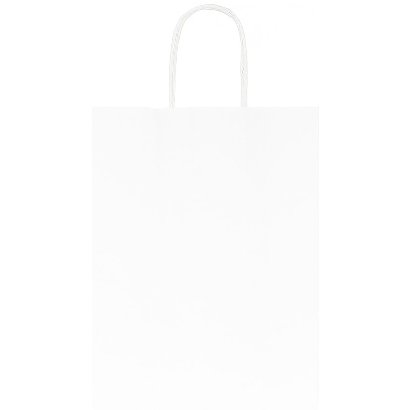 Digitaltrykt hvit papirpose. Håndtakene er vridd og forsterket. Papirposen tåler en maksimal vekt på 6 kg. Siden posen er digitaltrykt, er leveringstiden kort.