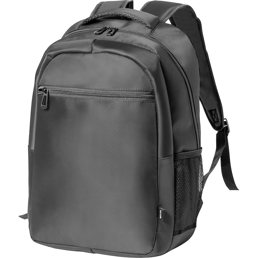 PC-ryggsekk med trykk av resirkulert nylon. Innvendig er det et polstret rom til en 15'' bærbar PC. På forsiden er det en mindre lomme med glidelåslukking. Det er reim til trillebag på baksiden.