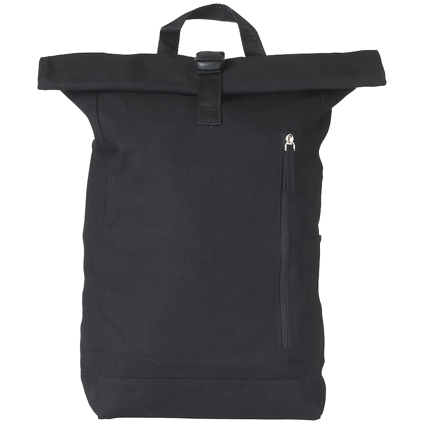 Rolltop-ryggsekk av kraftig kanvas. På den ene siden er det en mindre lomme, og på forsiden er det en større lomme med glidelås. Det er bare mulig med 1-fargetrykk.