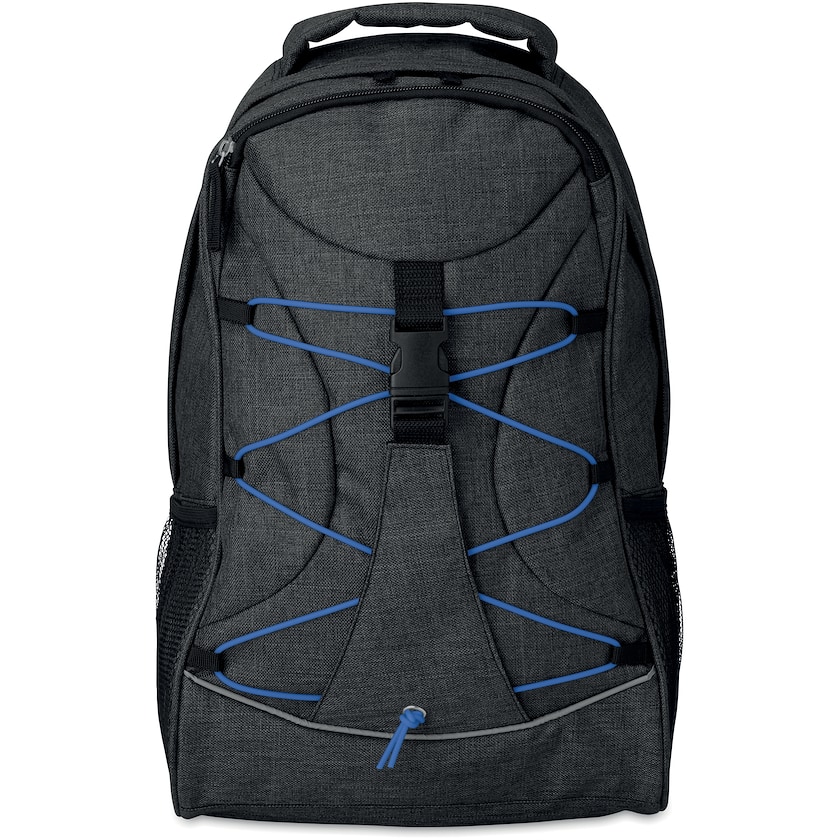 Ryggsekk med snorer som lyser i mørket. På sidene av ryggsekken er det nettinglommer til drikkeflasker. Det er et bærehåndtak på toppen. Snorene er av typen "glow in the dark".