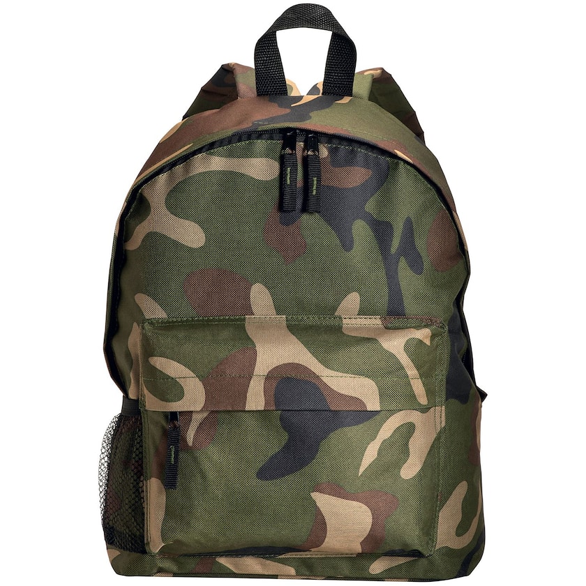 Kamuflasjefarget ryggsekk med trykk. Foruten hovedrommet er det også en oppbevaringslomme med glidelåslukking. Det er en nettinglomme på den ene siden. Baksiden og skulderremmer er polstret. Det er bare mulig med 1-fargetrykk.