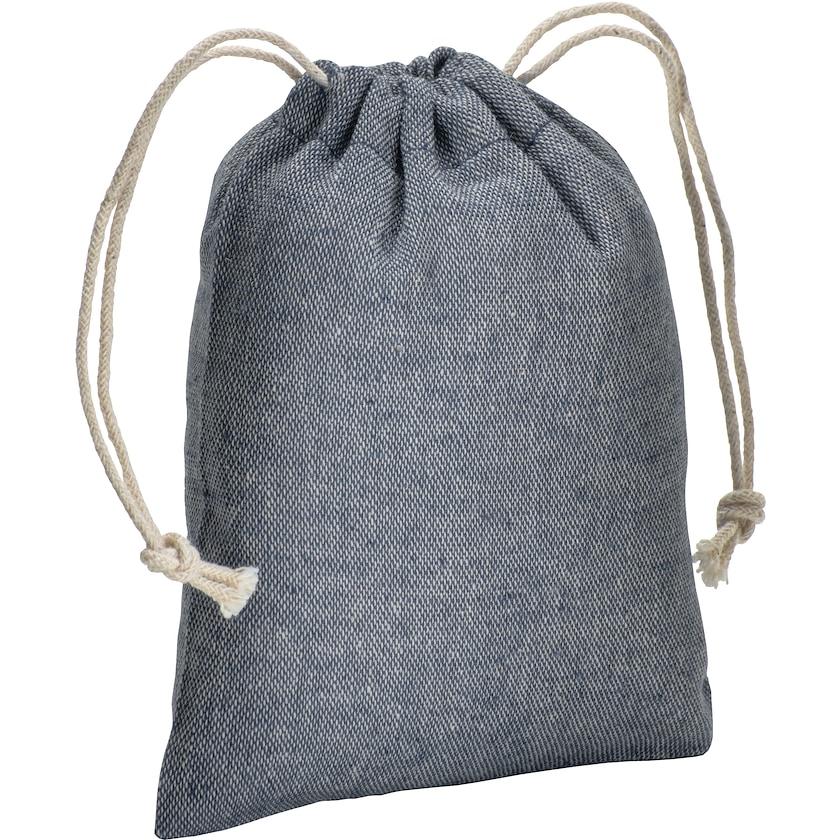 Liten bomullspose av resirkulert bomull. Stoffet veier 150 gram og er lett melert.