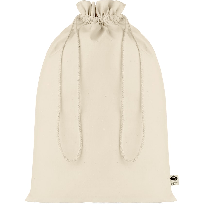 Stor gavepose av økologisk bomull. Posen er laget av et naturfarget 105 grams stoff. På den ene siden er det en etikett som viser at posen er laget av økologisk bomull.