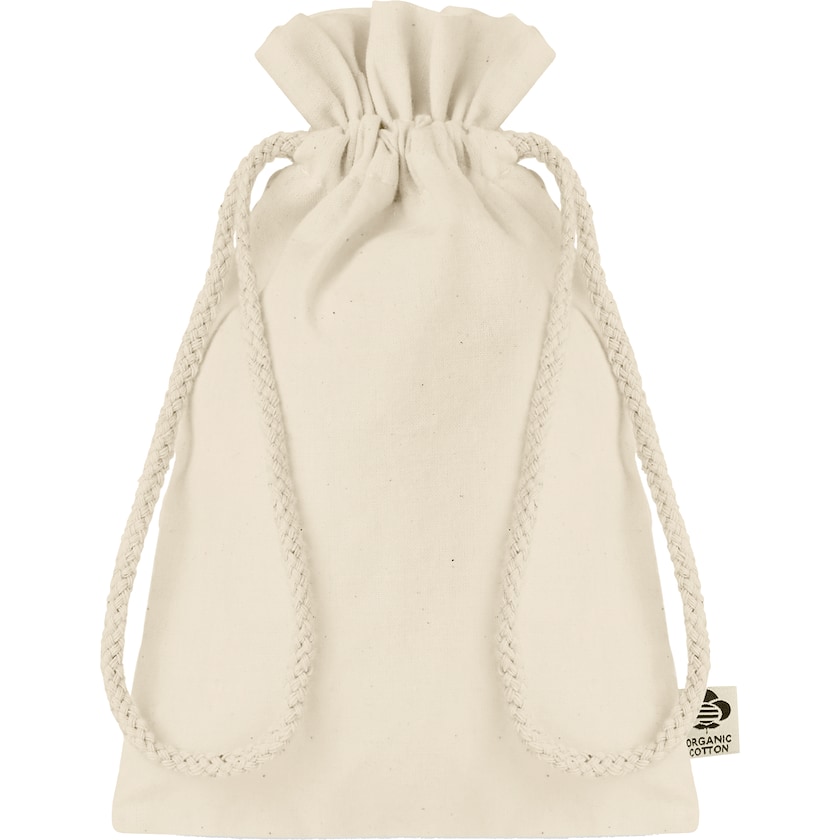 Liten bomullspose av økologisk bomull. Perfekt til deg som skal gi bort en liten gave! På den ene siden er det en etikett som viser at posen er laget av økologisk bomull.