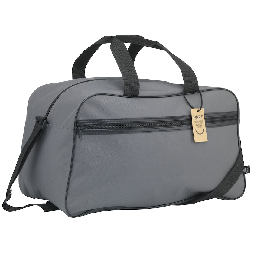 Romslig sportsveske av resirkulert materiale. Vesken er laget av RPET, dvs. resirkulerte PET-flasker. På forsiden er det en mindre lomme med glidelåslukking. Det er bare mulig med 1-fargetrykk.